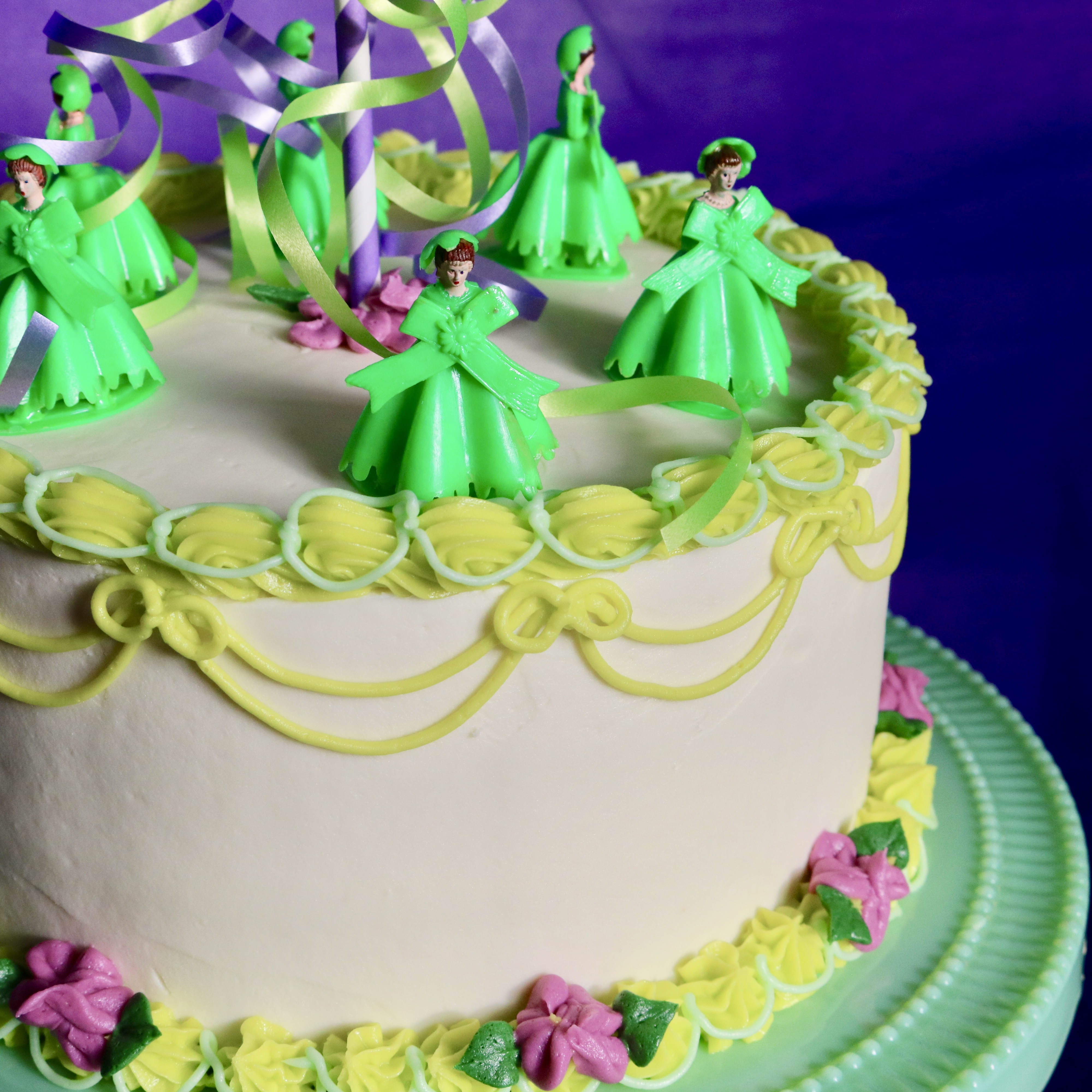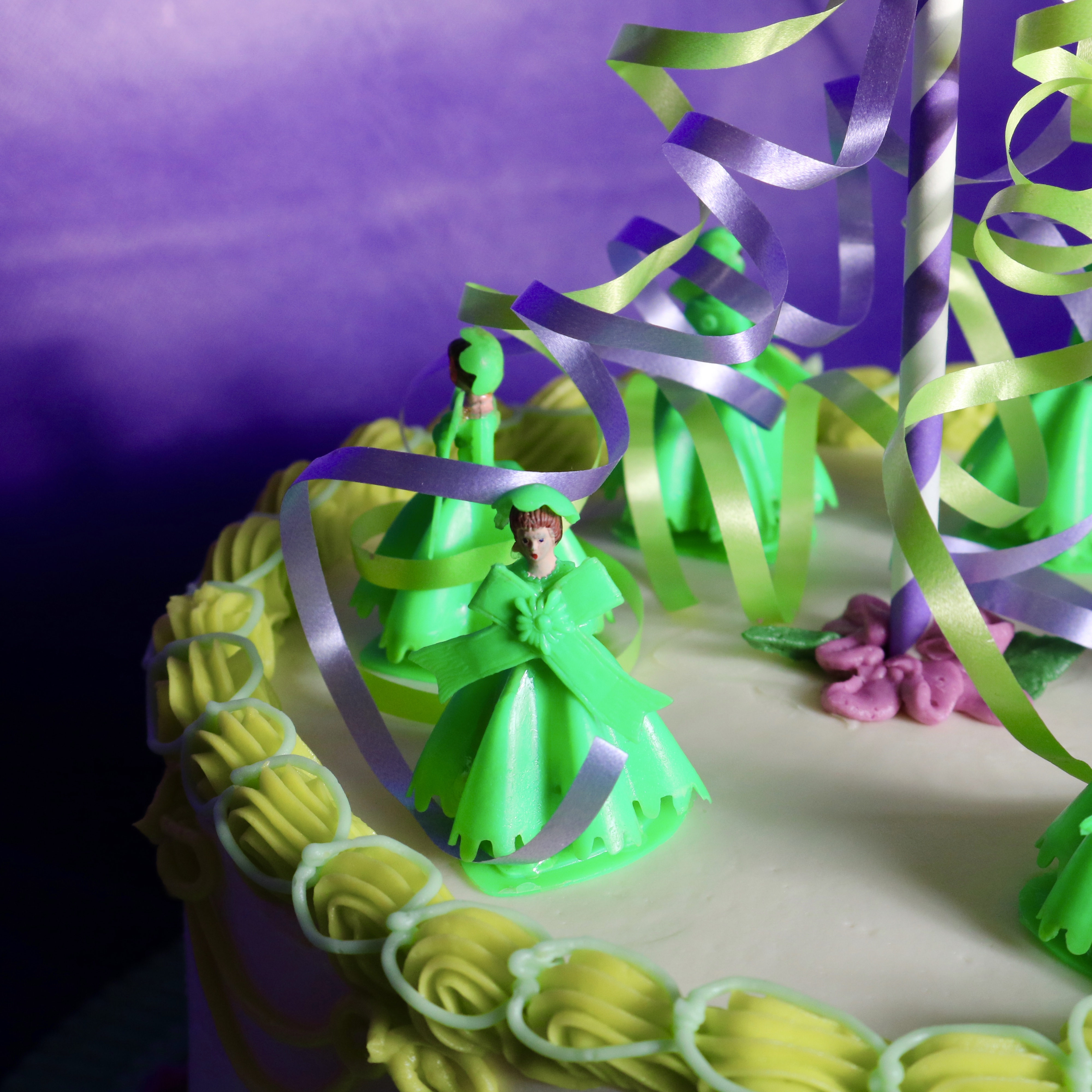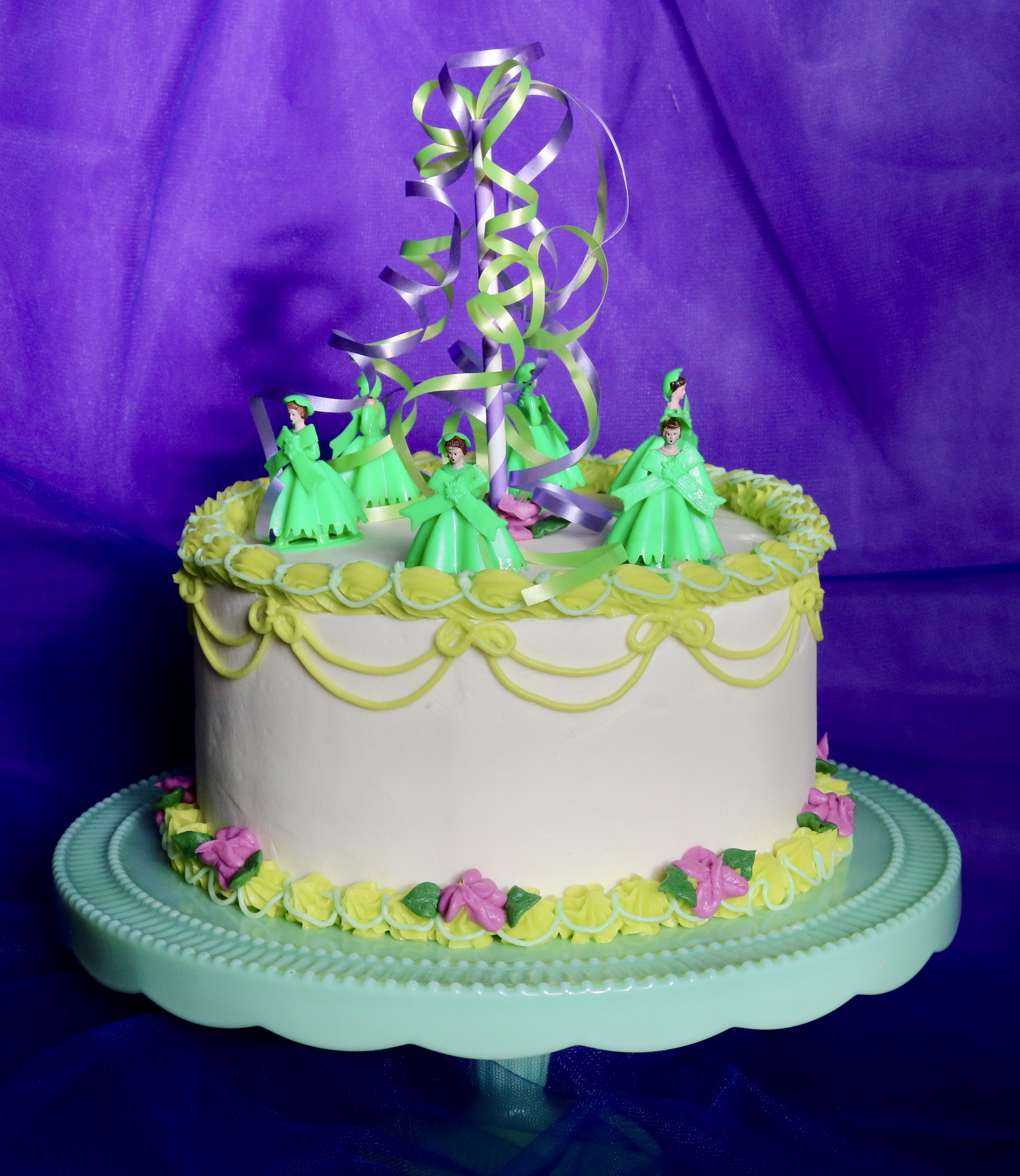 I knew when I first laid eyes on this May Pole Cake that I wanted to try and recreate it. I love the originality of the pole component and the little prom people figurines. I love the vivid greens and purple and yellow-y chartreuse that remind me of the vibrancy of spring grass. It’s the perfect celebration cake for a much needed change of weather and turn of the season.
